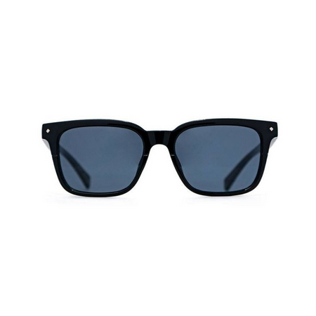 Lunettes de soleil mixtes au design classique et intemporel. Elles présentent une monture noire brillante et des verres gris.