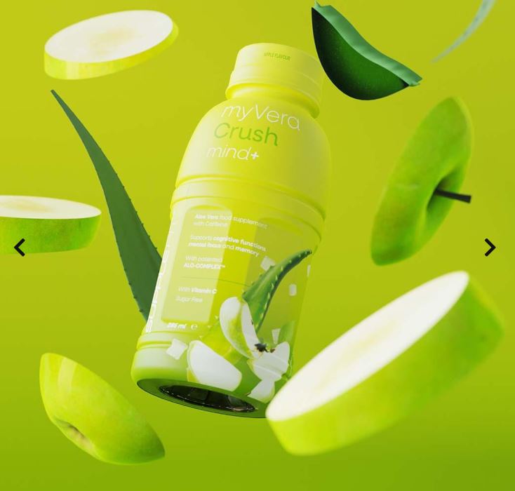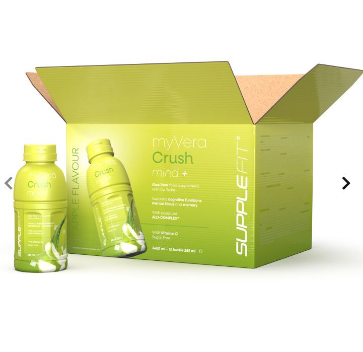 MYVERA CRUSH Mind + est un complément alimentaire nootropique avec caféine à base de jus et de pulpe d'Aloe vera et de Vitamine C, caractérisé par un délicieux arôme de pomme. Possédant de nombreuses propriétés bénéfiques, l'Aloe Vera et la vitamine C sont convenablement équilibrés dans la boisson pour former le complexe breveté ALO-COMPLEX™, qui exerce une action purifiante et antioxydante sur le corps. Conçue pour soutenir la mémoire, renforcer les différentes fonctions cognitives et favoriser la concentration, la formule spéciale de MYVERA CRUSH Mind + contient :