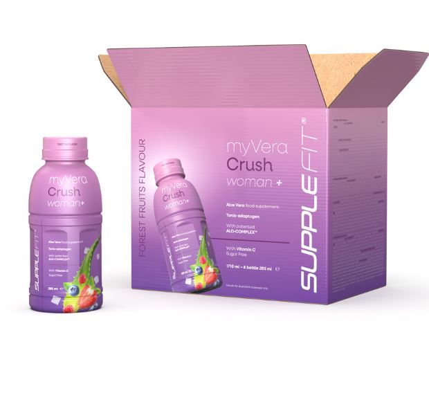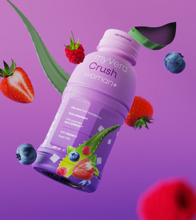 MYVERA CRUSH Woman + est un complément alimentaire tonico-adaptogène à base de jus et de pulpe d'Aloe Vera et de vitamine C, au goût délicieux de fruits rouges.